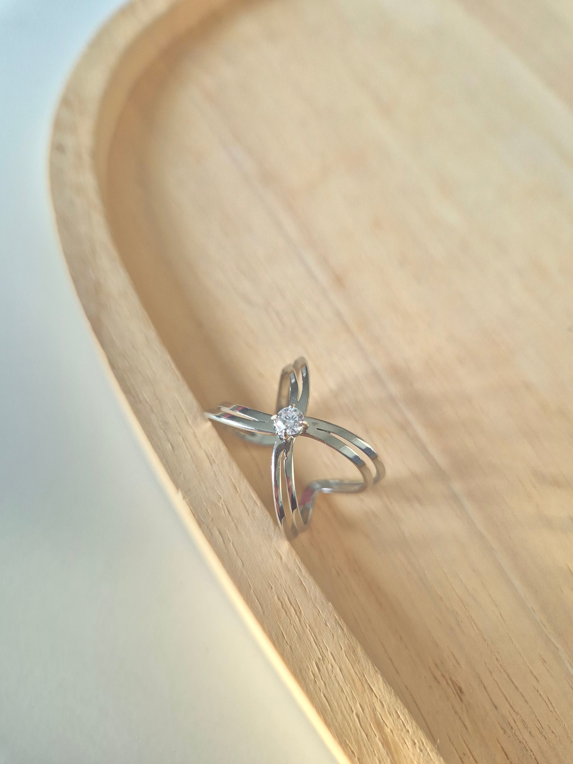 Bague argentée en acier inox, double anneau croisé avec pierre scintillante centrale.