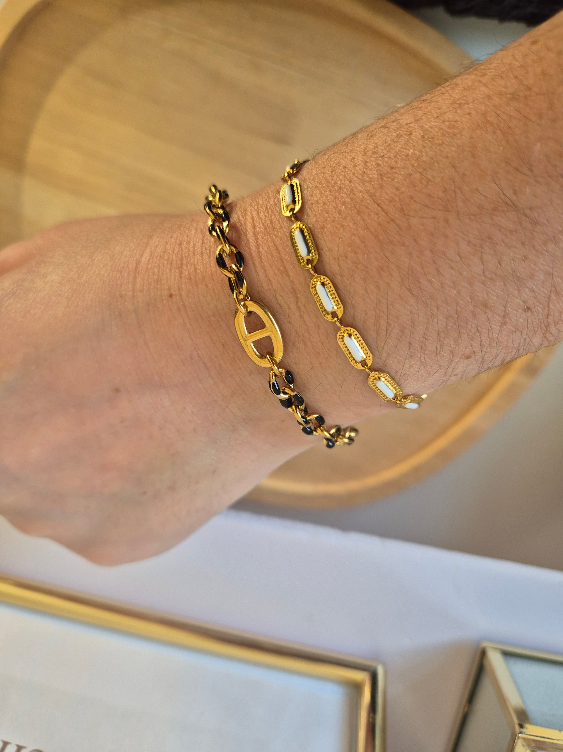 Ce bracelet Zélie ✨️ est un accessoire élégant pour toutes occasions. Avec un design à maillons noir et doré, ce bracelet est à la fois chic et tendance. Son connecteur grain de café ajoute une touche de sophistication. Disponible en longueur 15cm avec une extension de 5cm, il s'adapte à tous les poignets.